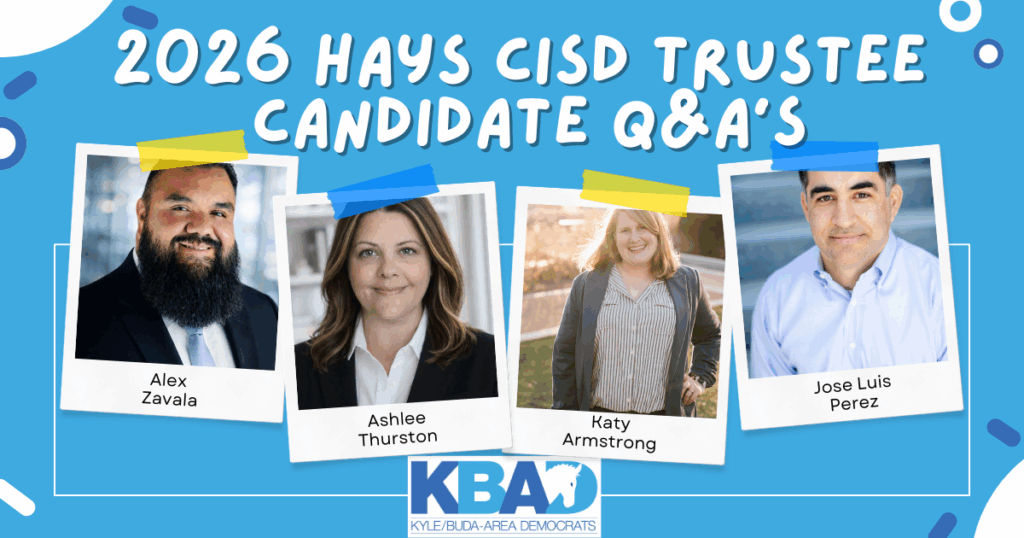 Kyle/Buda-Area Democrats sent a questionnaire to each candidate running in the May 2nd, 2026 Hays CISD Board of Trustees Election.